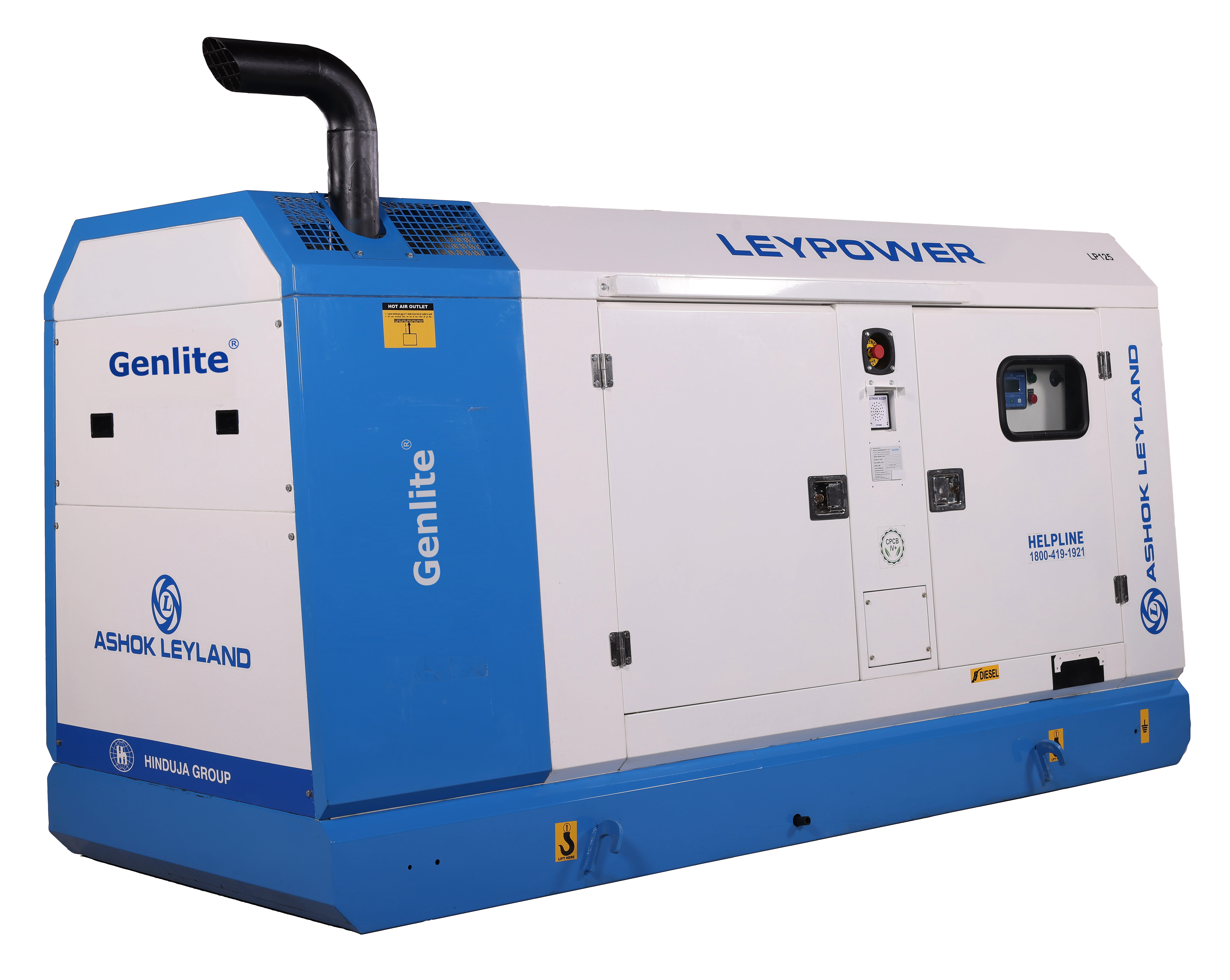 LP125 kVA 3 phase Diesel Generator set (415V; 100kW) powered by Ashok Leyland make engine model H6G4DE125 developing 154 HP @ 1500 RPM coupled with Leroy Somer Alternator, Standard Control Panel, Battery, complete with type approved canopy and all standard accessories.